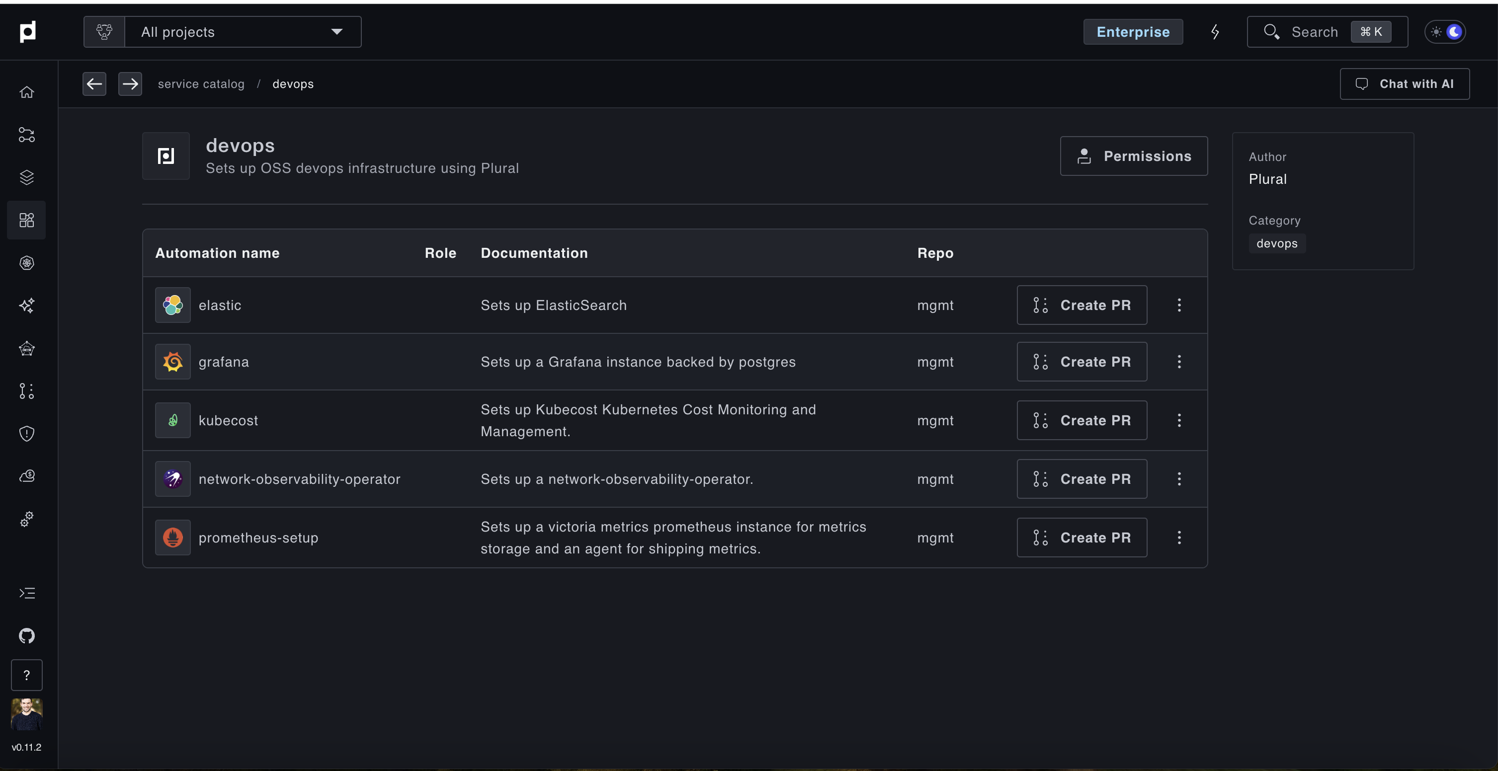 We already have a few streamlined setups in our service catalog to do this, you'll want to go to Catalogs -> devops (can do this with Cmd + K -> Catalog, or just use the sidebar), from there you should see a page like this: